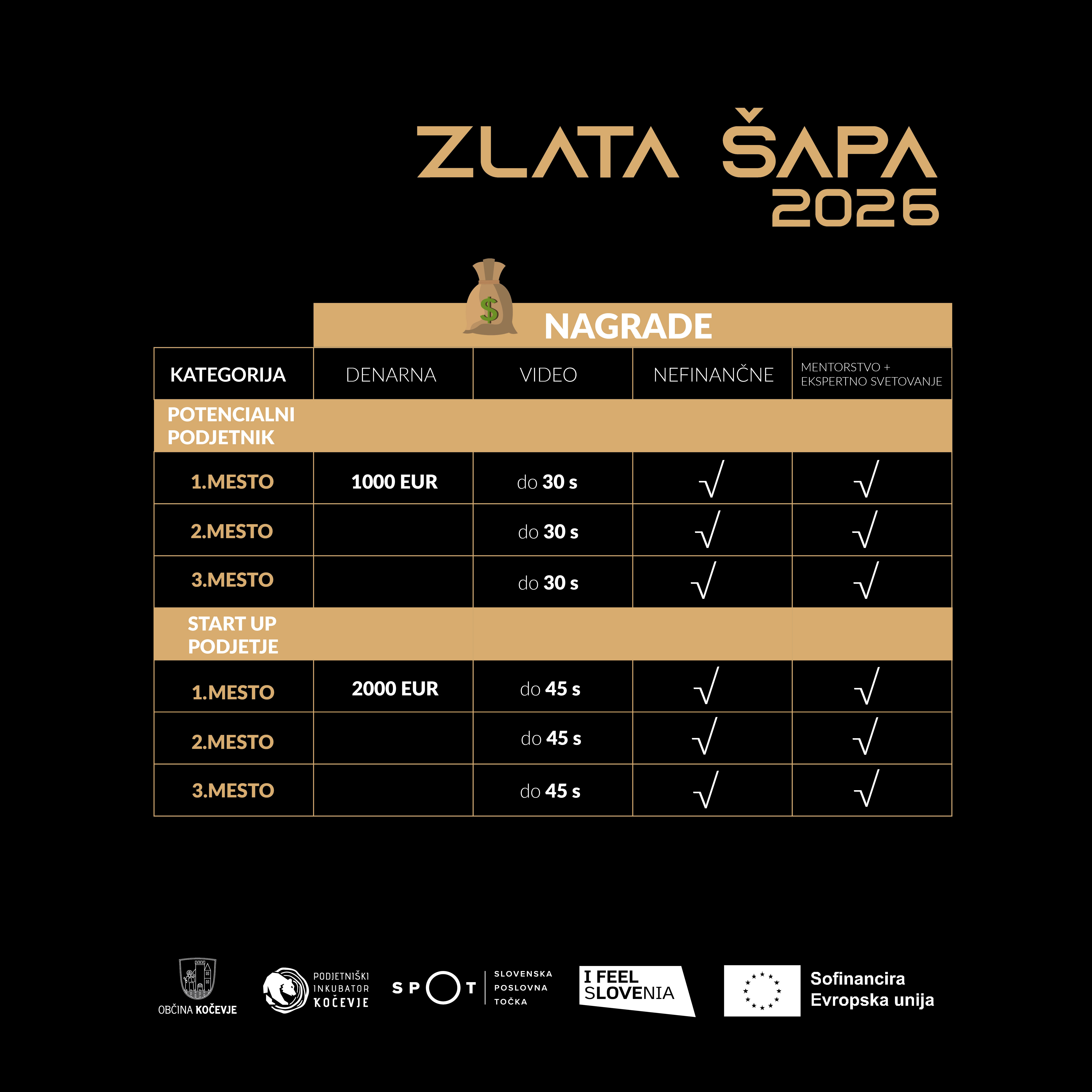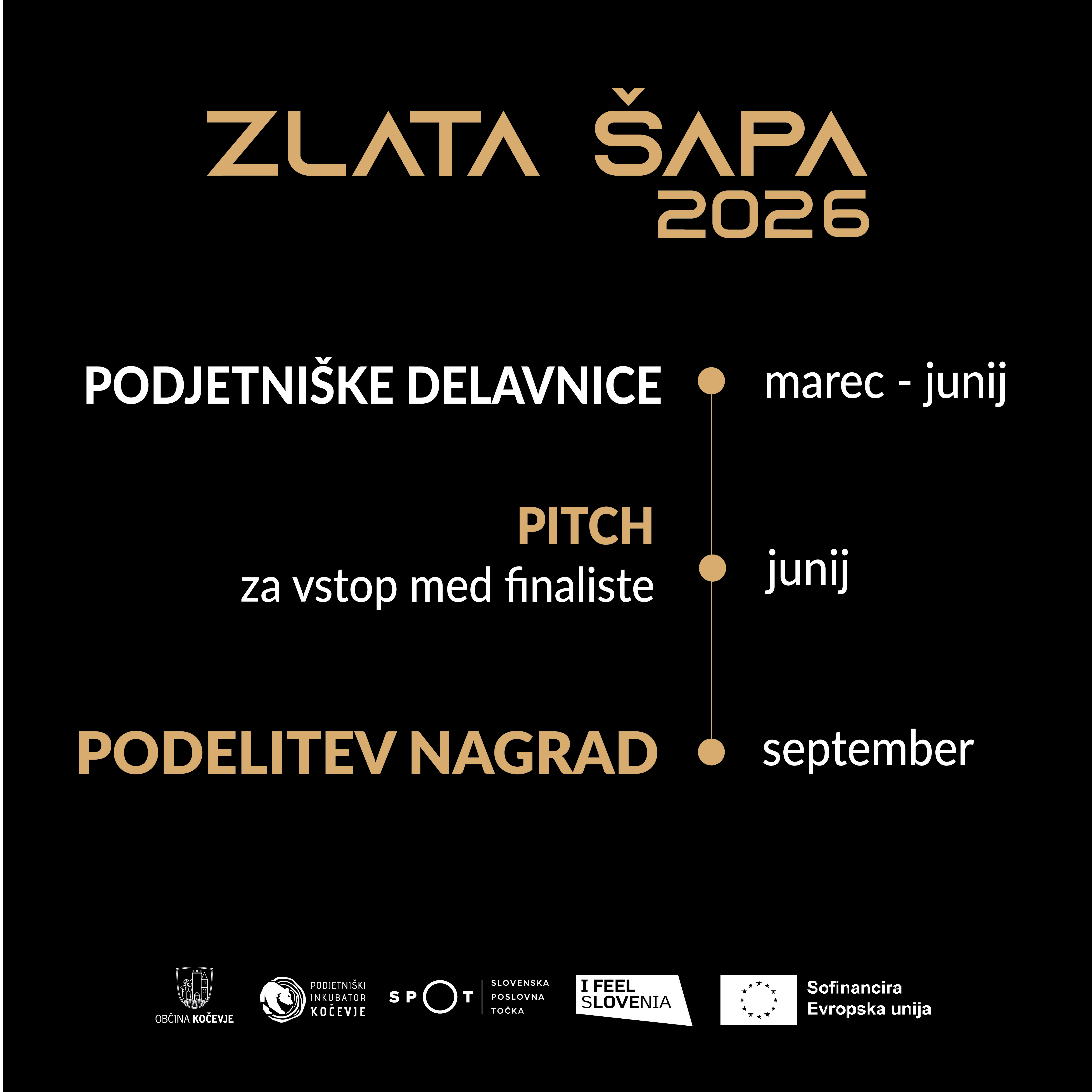Izbor perspektivnih mladih podjetij in poslovnih idej, kjer bodo podeljene nagrade ZLATA ŠAPA 2026, bo potekal na zaključni prireditvi 24. septembra 2026. Število mest na natečaju je omejeno, zato si pravočasno zagotovite svojo prijavo! Na posamezne delavnice se boste lahko prijavili prek kariernega portala. Sodelovanje na natečaju je brezplačno, vendar zahteva brezpogojno sprejemanje vseh pravil in pogojev sodelovanja, kot so določeni v razpisni in prijavni dokumentaciji.