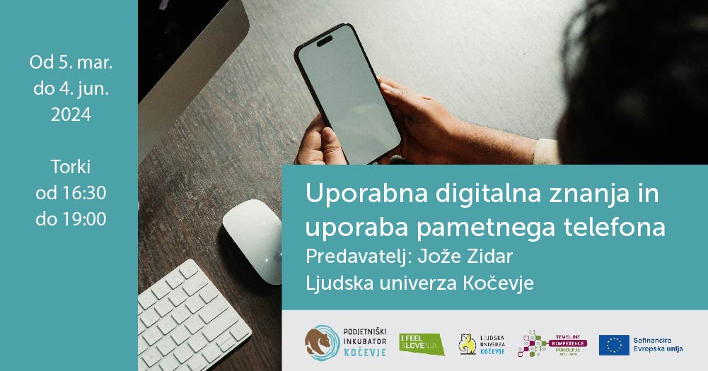 POZOR! Zaradi velikega povpraševanja razpisujemo dodatni tečaj Uporabna digitalna znanja na Ljudski univerzi Kočevje. Tečaj obsega 40 pedagoških ur in bo trajal od začetka meseca marca do začetka meseca junija 2024.